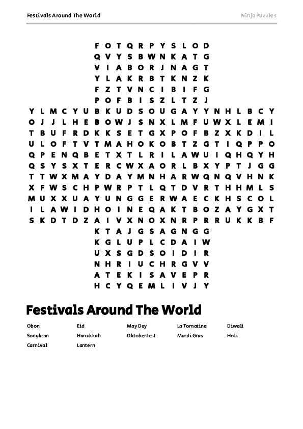Free Printable Festivals Around The World themed Word Search Puzzle