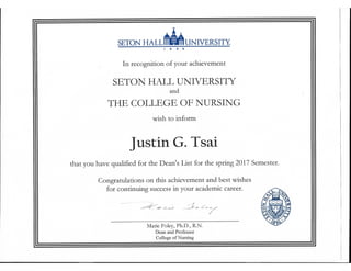 Seton Hall BSN Deans List Certificates pdf