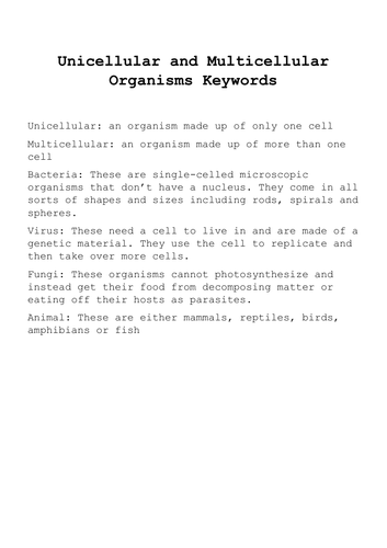 Unicellular and Multicellular Crossword Word Search Worksheet