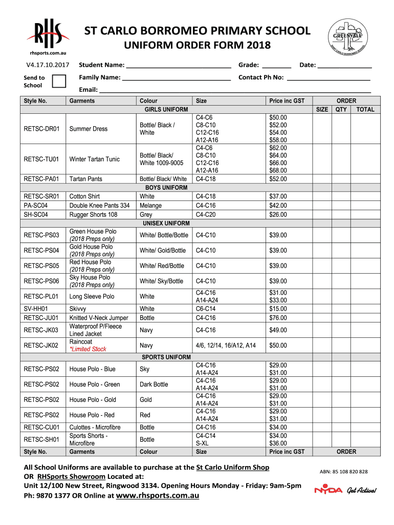 Fillable Online UNIFORM ORDER FORM Jannali East Public School Fax