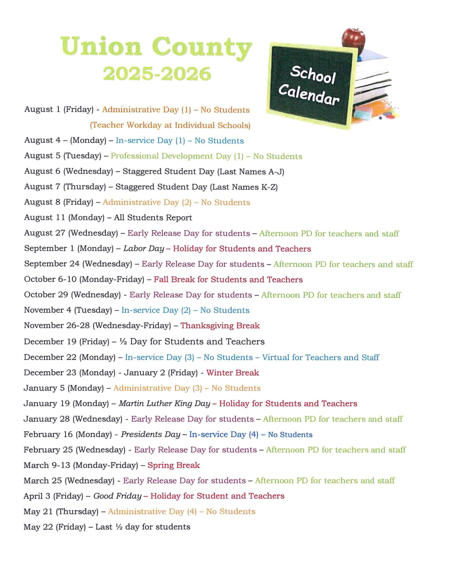 Union County Public Schools Calendar 2025 2026 (Holidays)