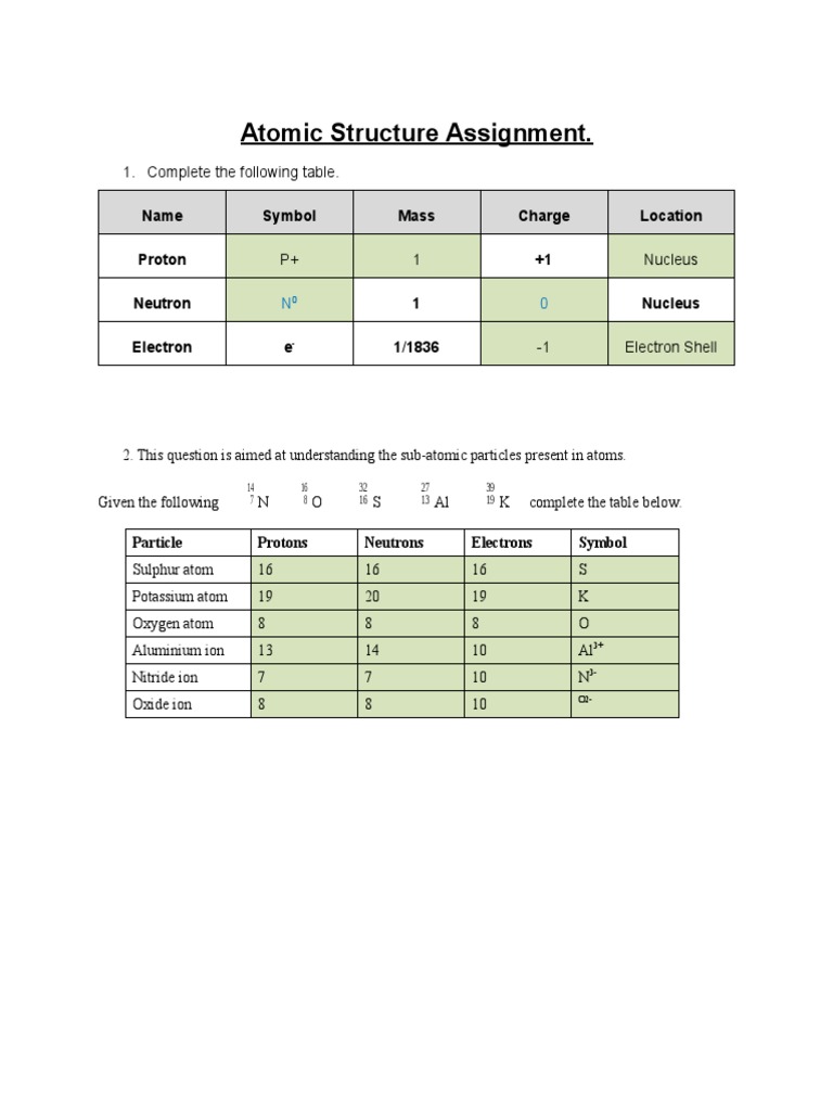 Atomic Structure Worksheet PDF Proton Chemical Elements