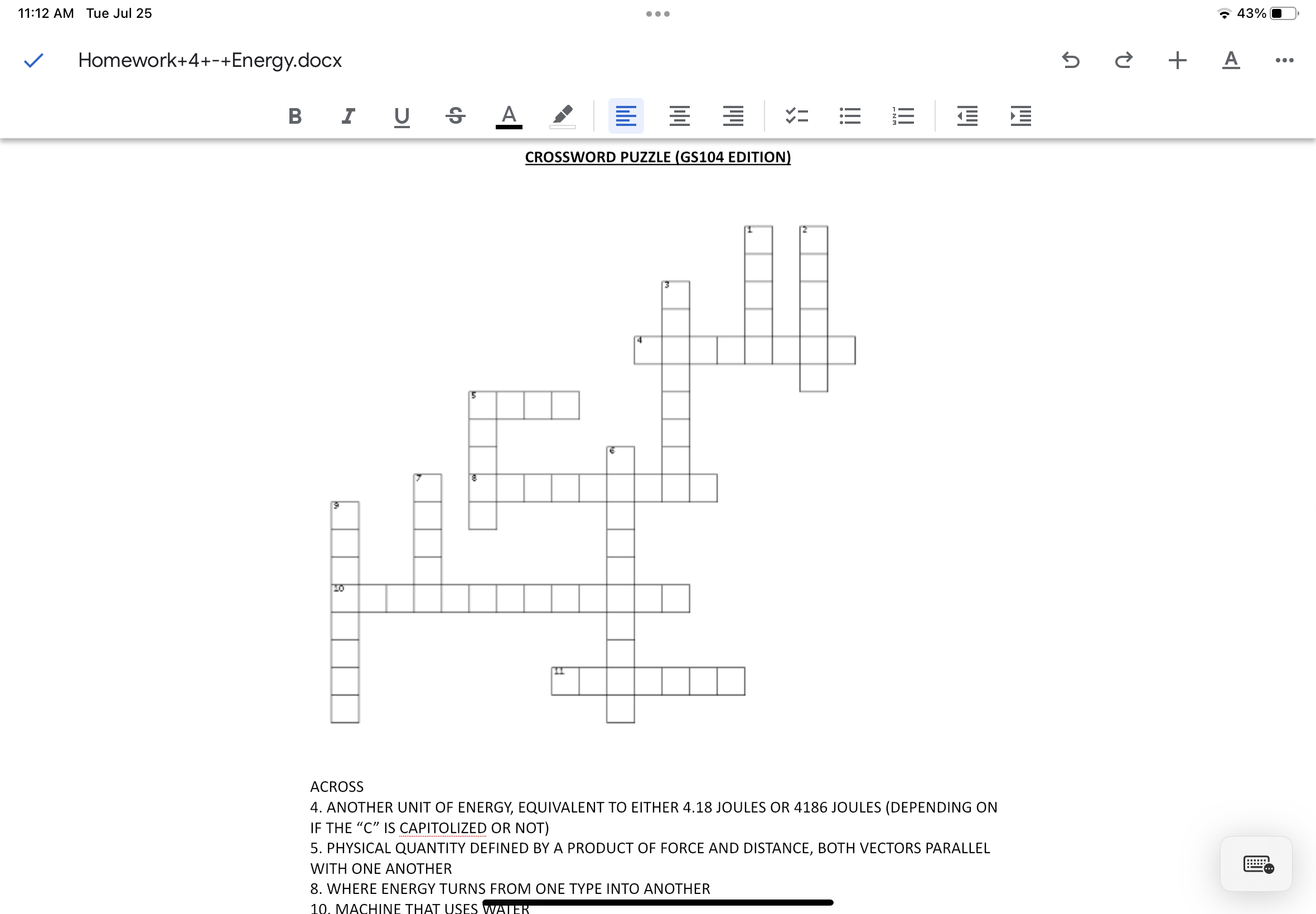 Topic 1 Energy Crossword by Catelyn Williams TPT