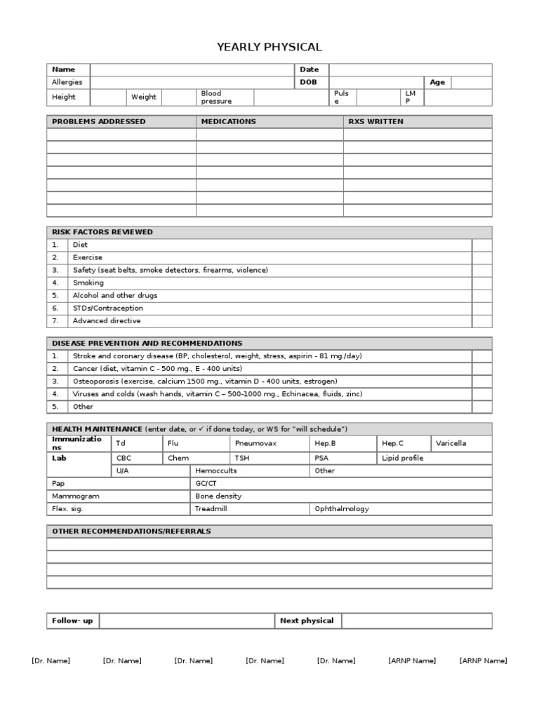 Yearly Physical Form PDF Medical Specialties Clinical Medicine