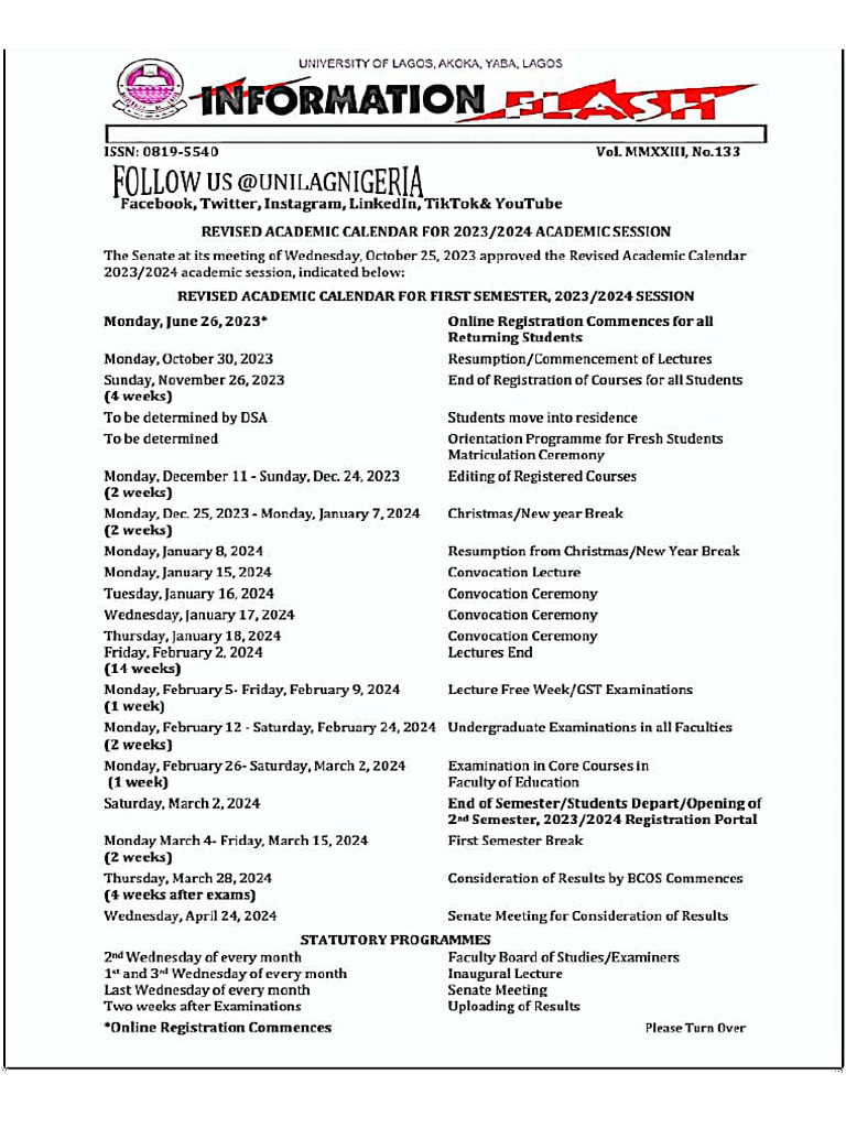 Unilag Revised Academic Calendar PDF