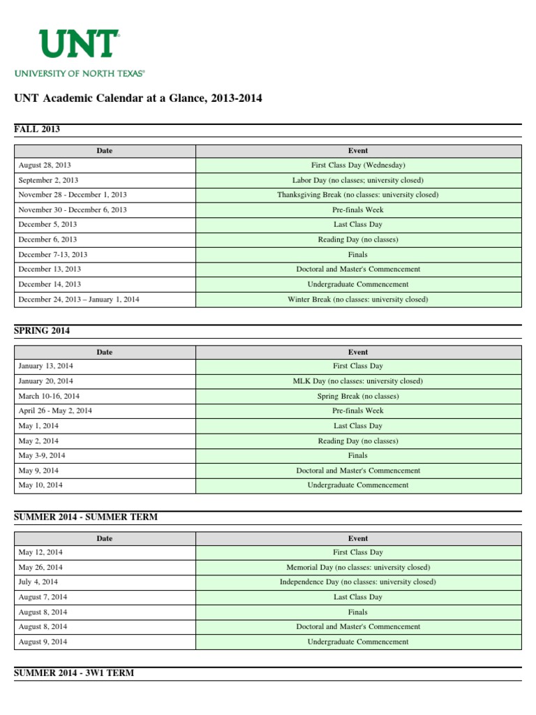 UNT Academic Calendar at A Glance 2013 2014: FALL 2013 PDF Further