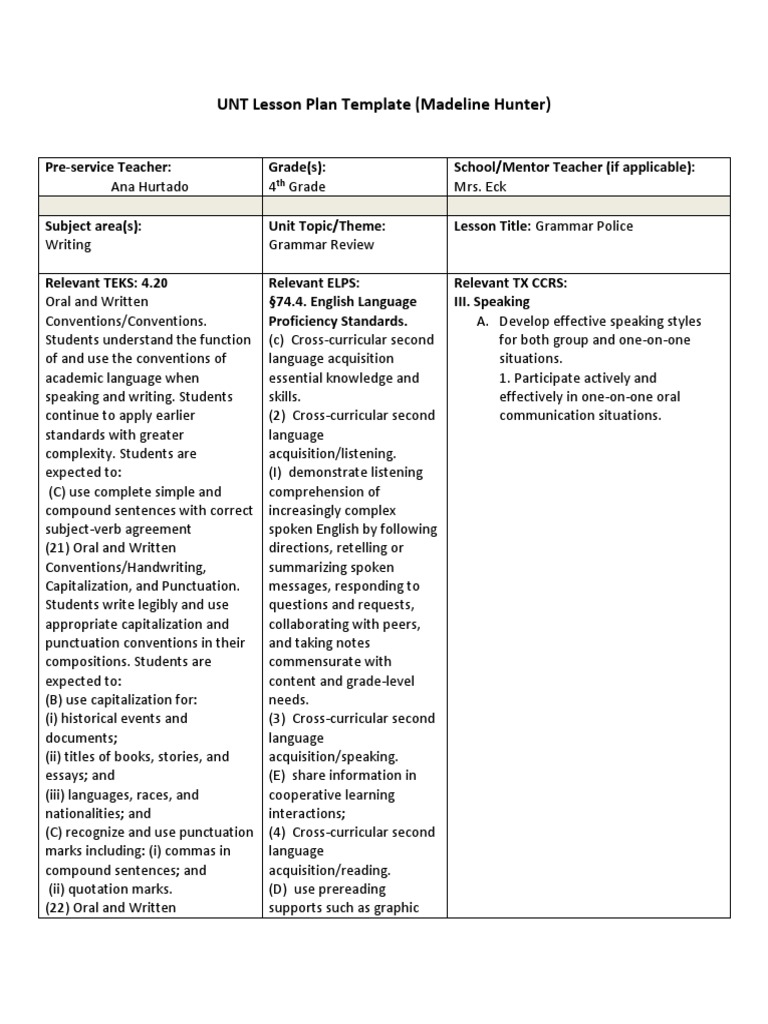 UNT Lesson Plan Template Madeline Hunter PDF Sentence (Linguistics