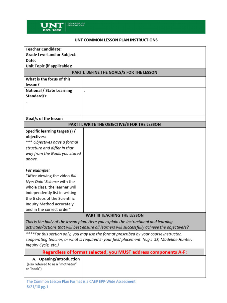 Blank UNT Common Lesson Plan Instructions and Template (1) 1 PDF