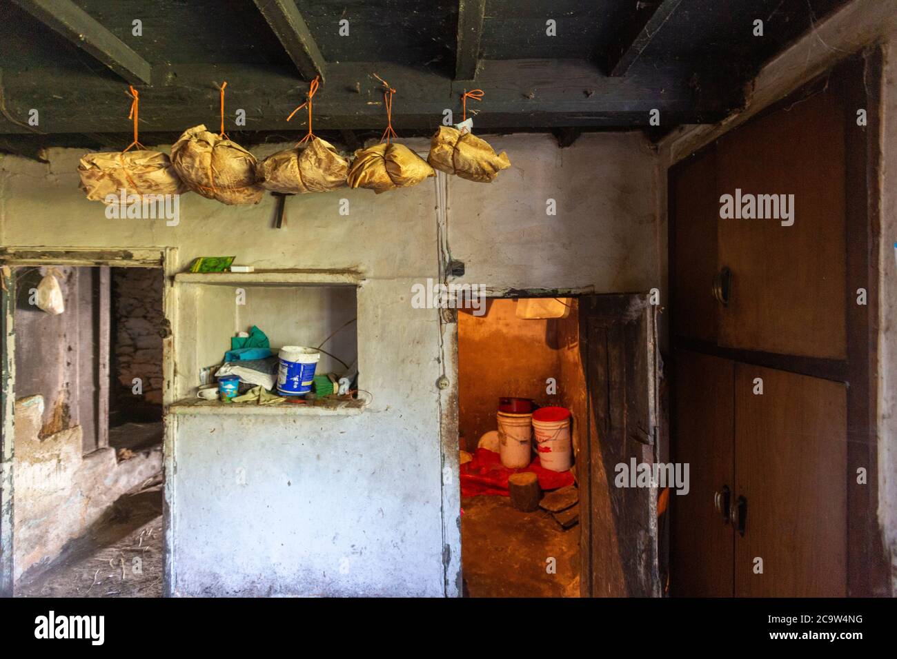 Unto (fat of the pig) hanging in a decaying rustic house in Paradela