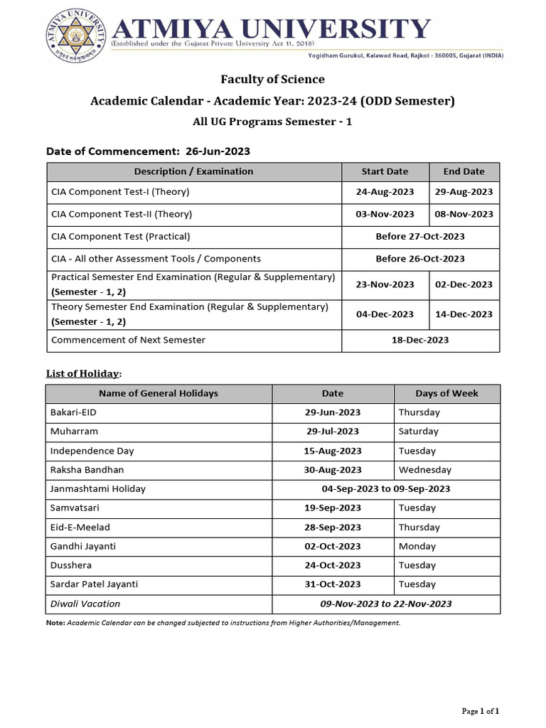 University Calendar 2023 2024 University of VAPA