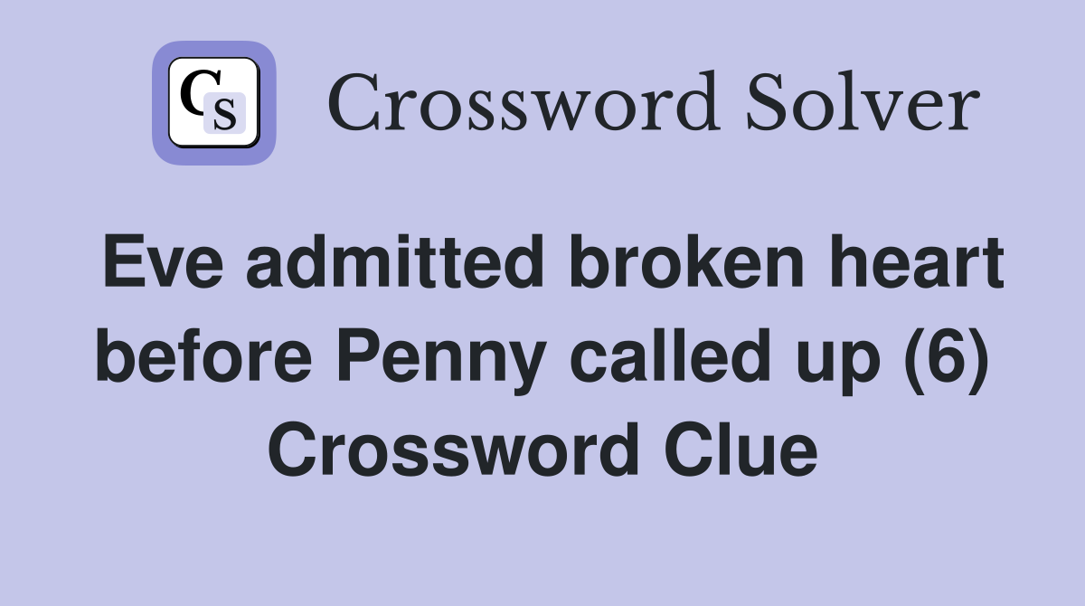 Eve admitted broken heart before Penny called up (6) Crossword Clue