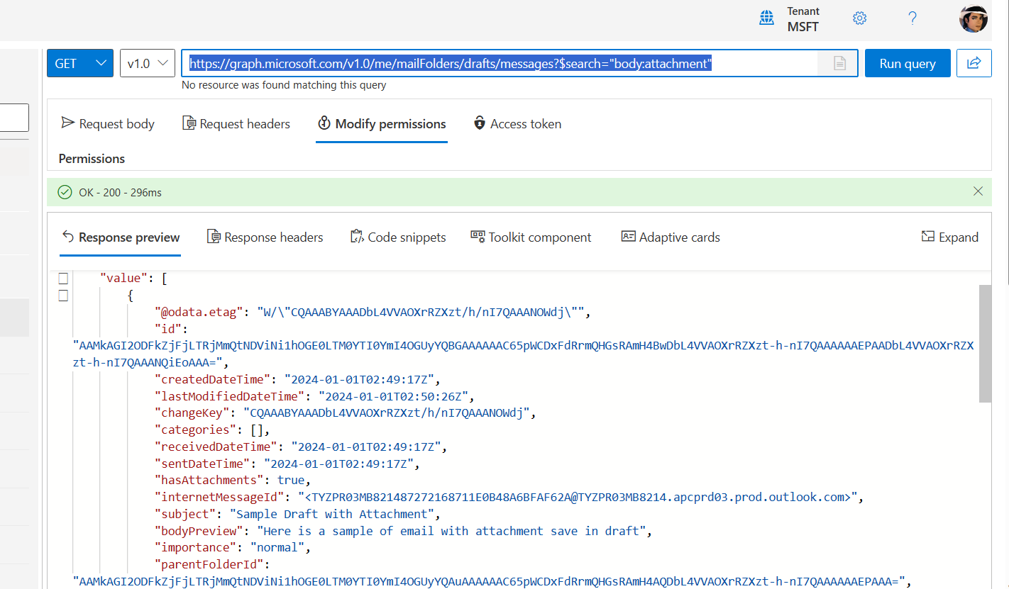 Drafts mailbox has an email with attachment Using graph api https