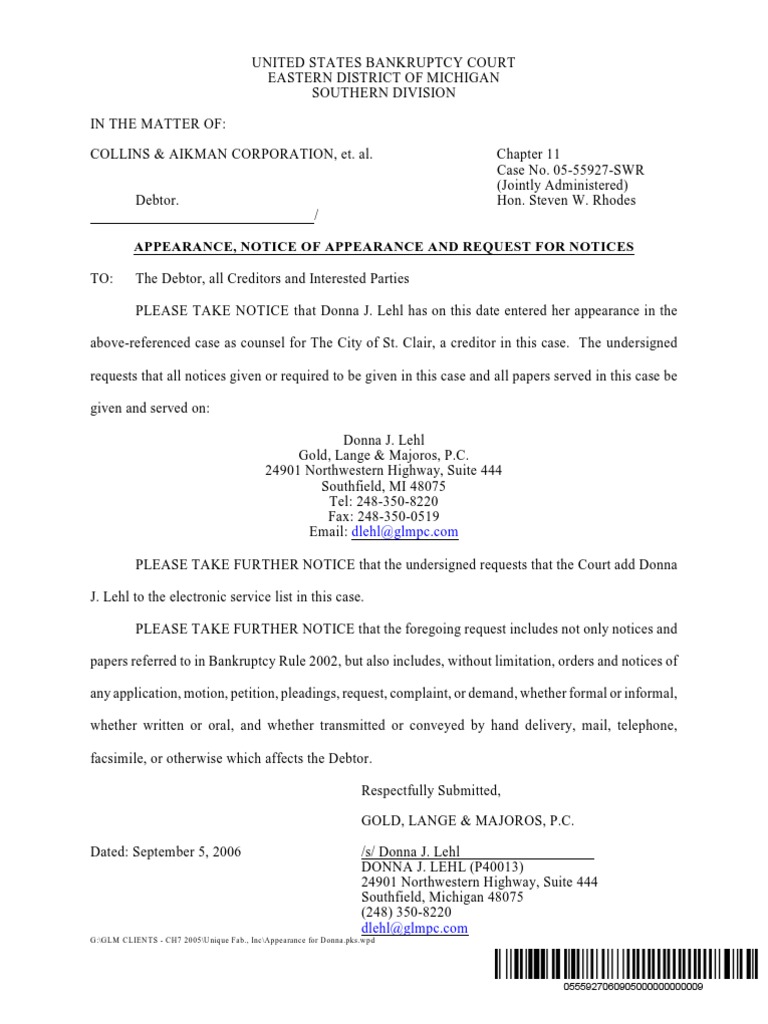 Notice of Appearance and Request For Special Notice PDF Bankruptcy