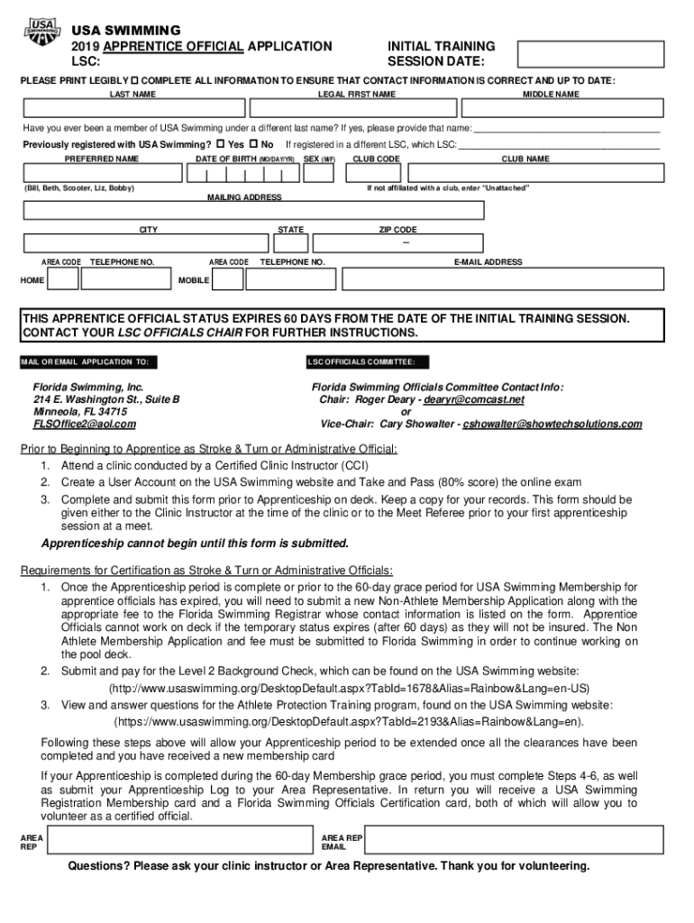 Fillable Online usa swimming 2019 apprentice official application