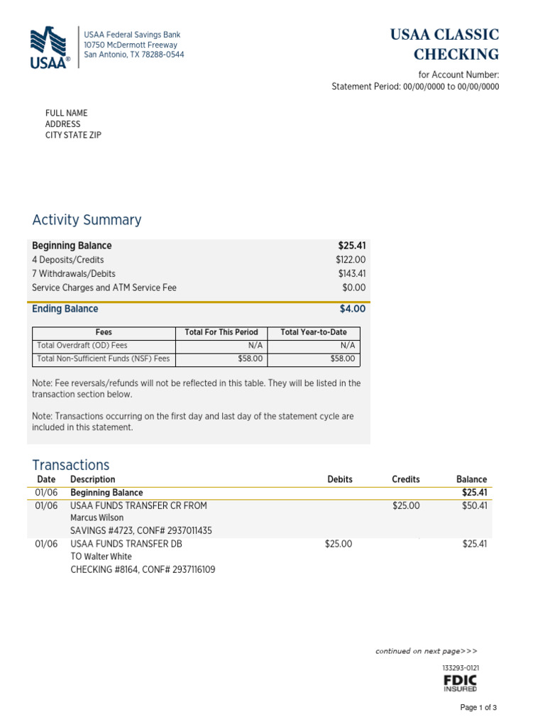 USAA Checking Account Summary PDF Transaction Account Overdraft