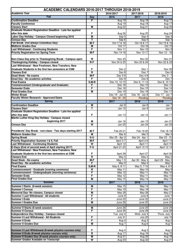Academic Calendars 2016 2017 Through 2018 2019 PDF Academic Term