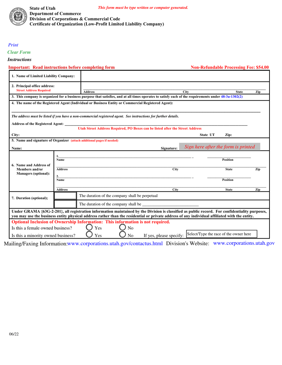 Utah Certificate of Organization (Low Profit Limited Liability Company