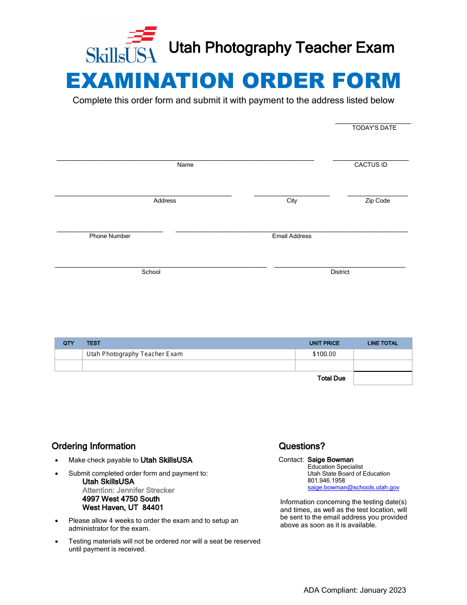 Utah Examination Order Form Utah Photography Teacher Exam Fill Out