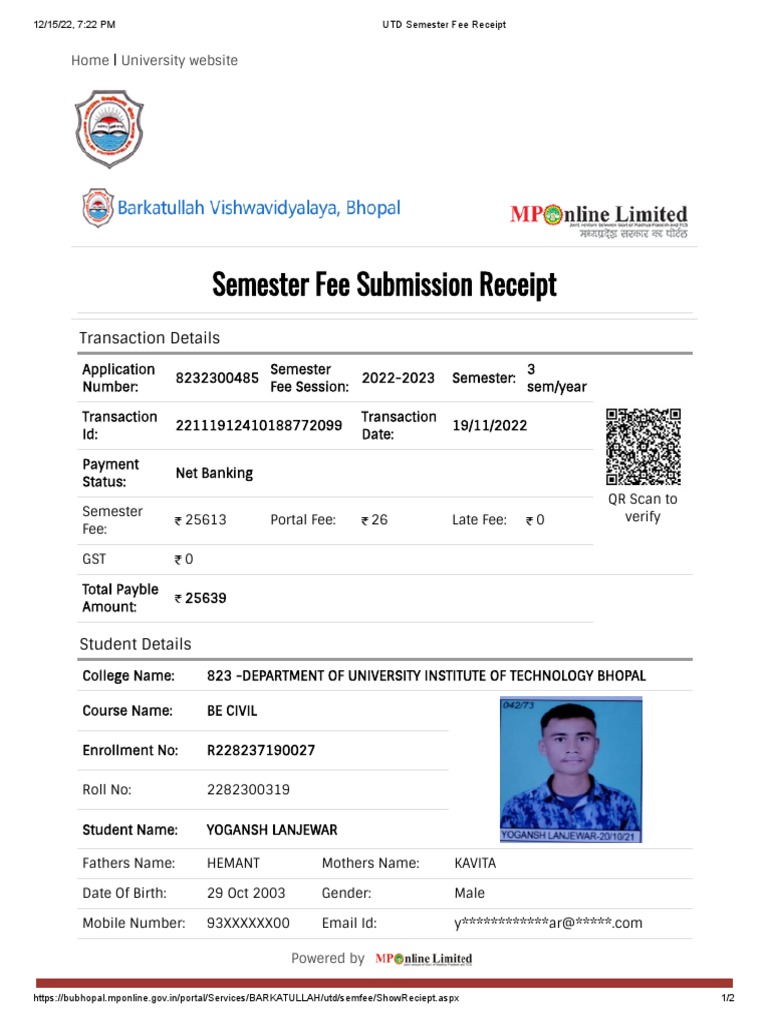 UTD Semester Fee Receipt Yogansh PDF Receipt Trade