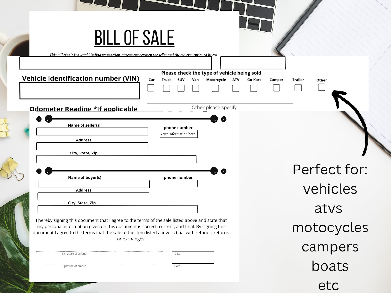 UTV Bill of Sale Blank Printable Form Template in PDF Word Etsy