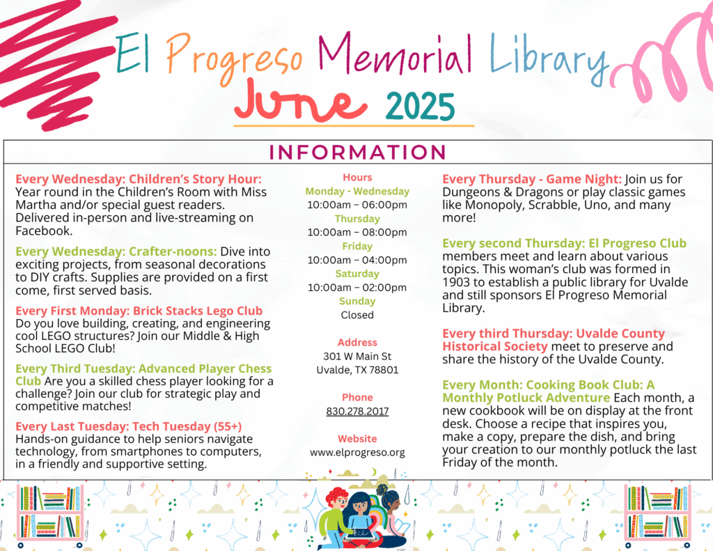 El Progreso Memorial Library June Calendar and Events Uvalde Hesperian
