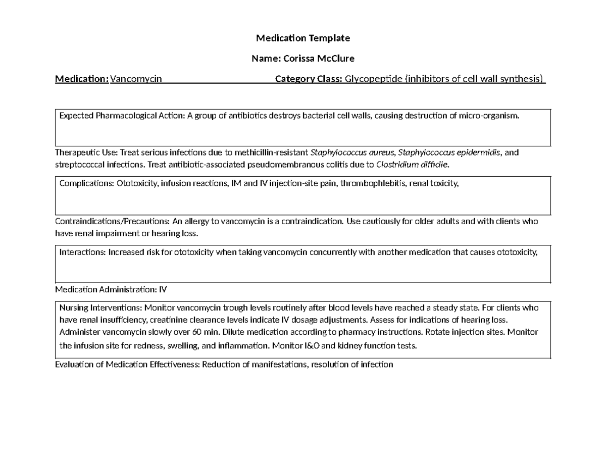 Vancomycin Med Template Medication Information Template Sabrina