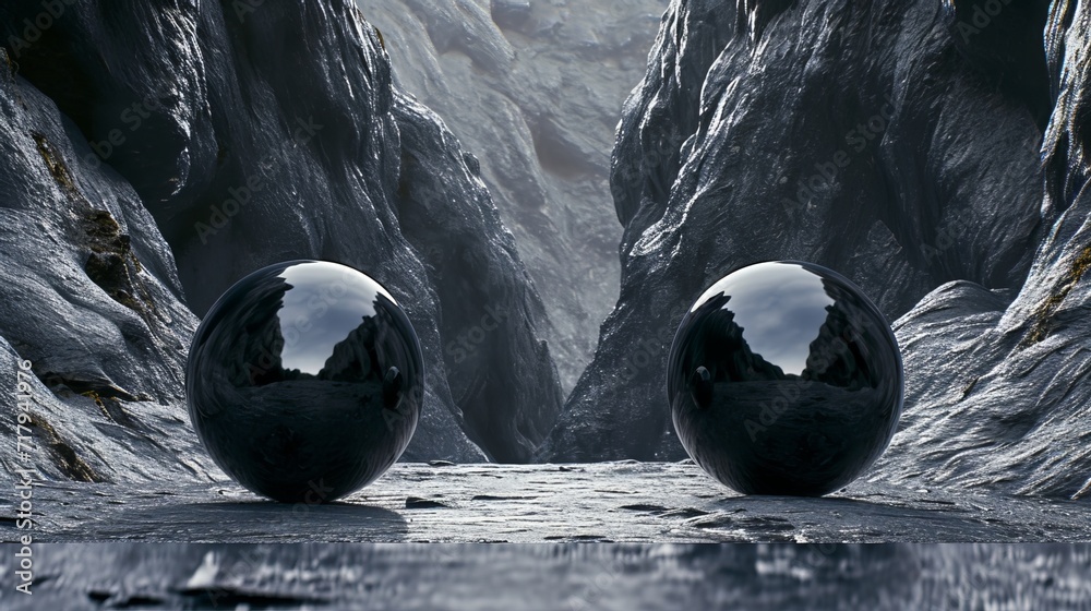 two perfect shiny smooth reflective dark gray metal orbs on either side