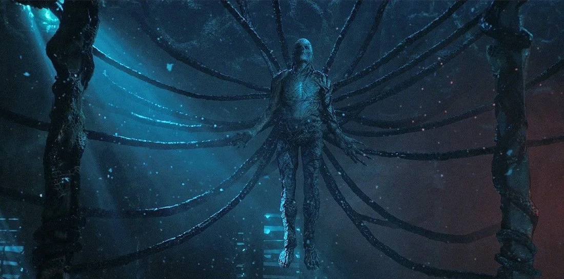 Behind Vecna #39 s #39 UV texture crawl #39 vines the fight of a Demogorgon and