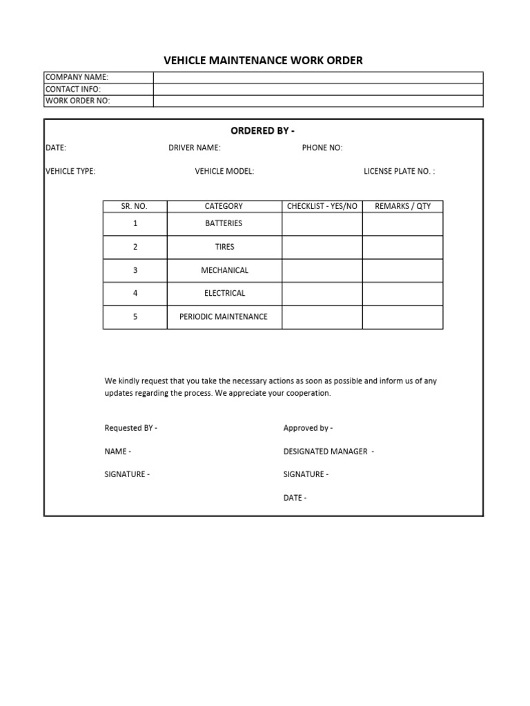 Vehicle Maintenance Work Order PDF