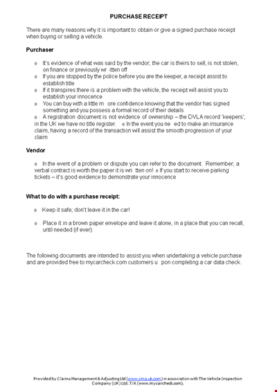 Vehicle Purchase Receipt Template Vendor Purchase Receipt