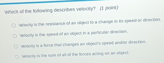 Solved: Which of the following describes velocity? (1 point) Velocity