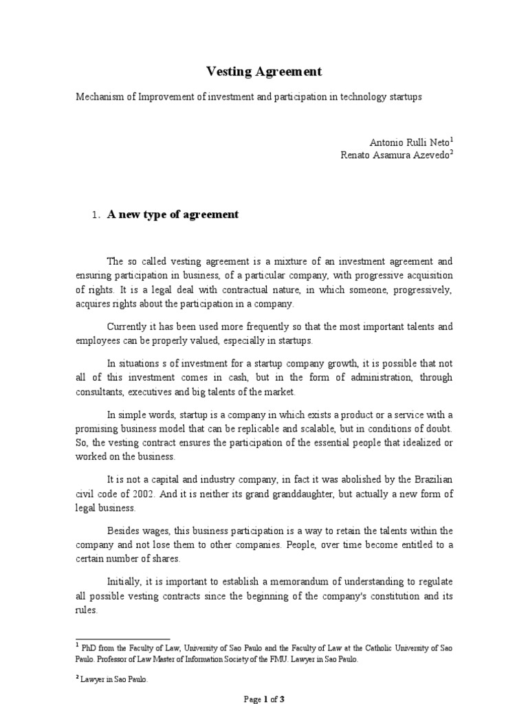 Vesting Agreement PDF Startup Company Small Business Entrepreneurs