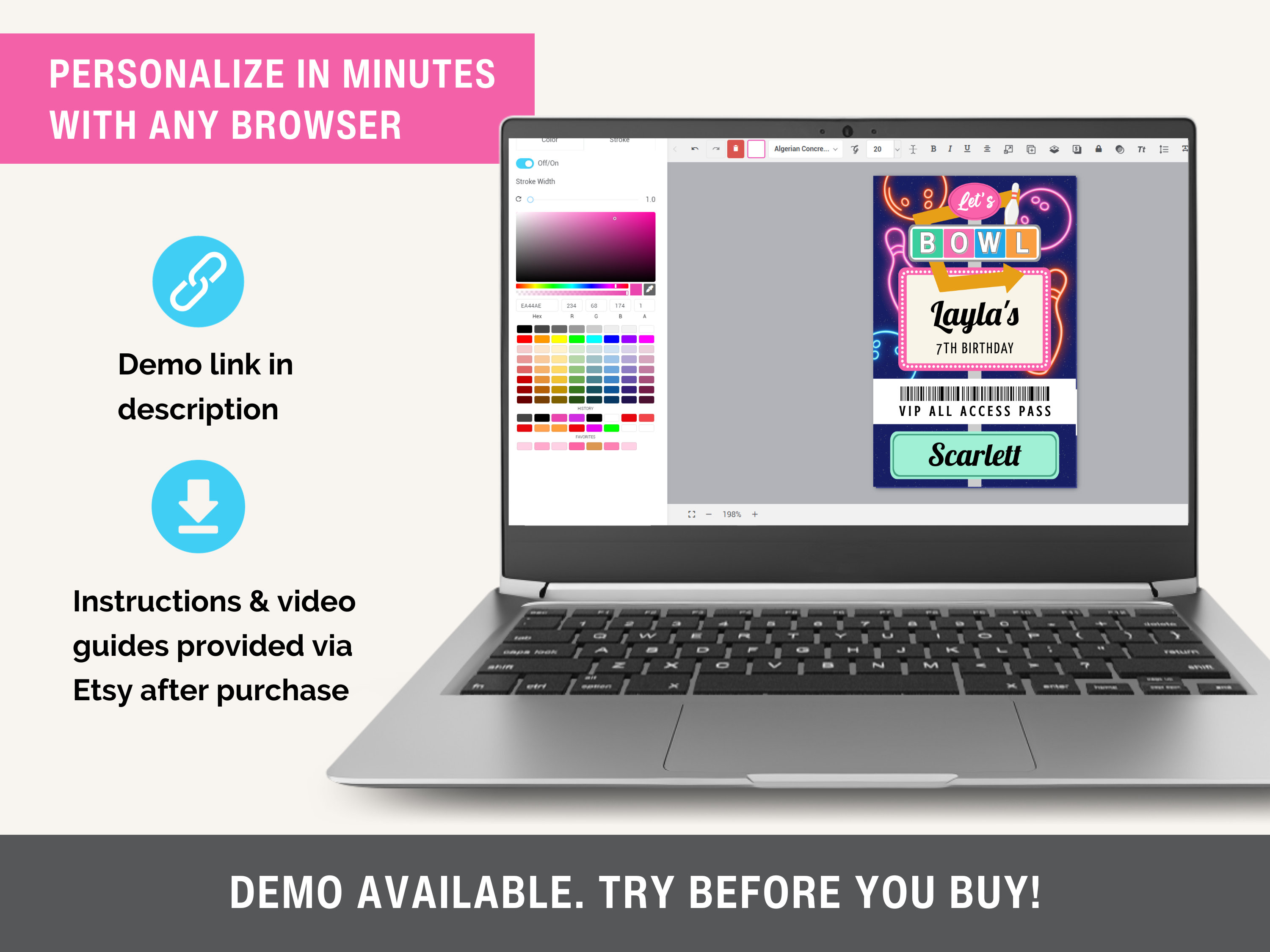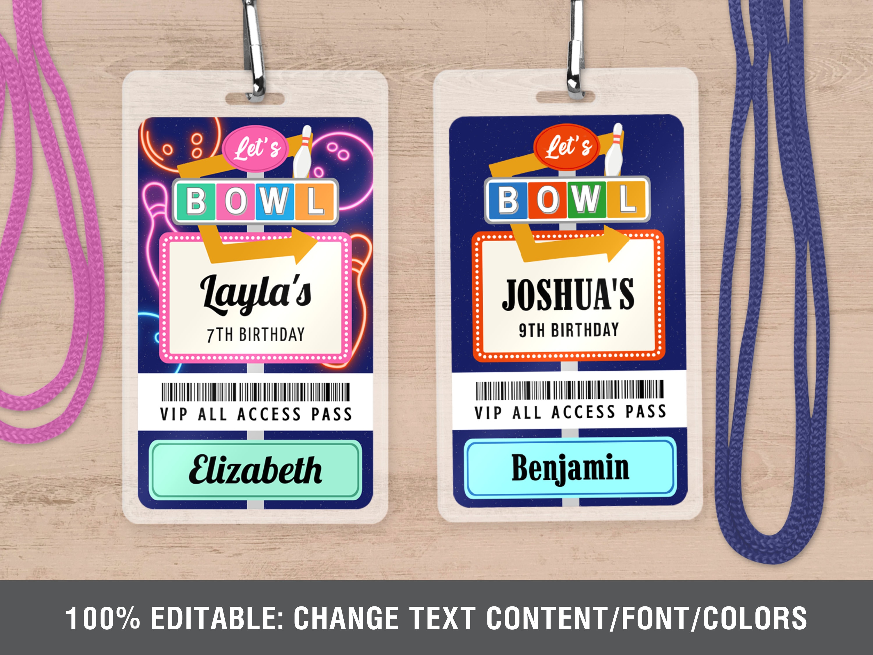 VIP Badge Template for Kids Birthday Party Personalized Neon Bowling