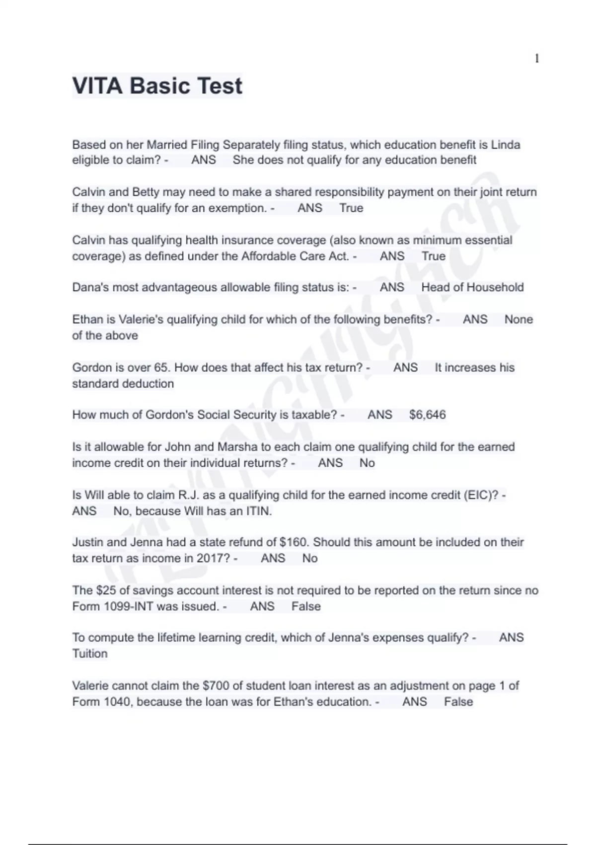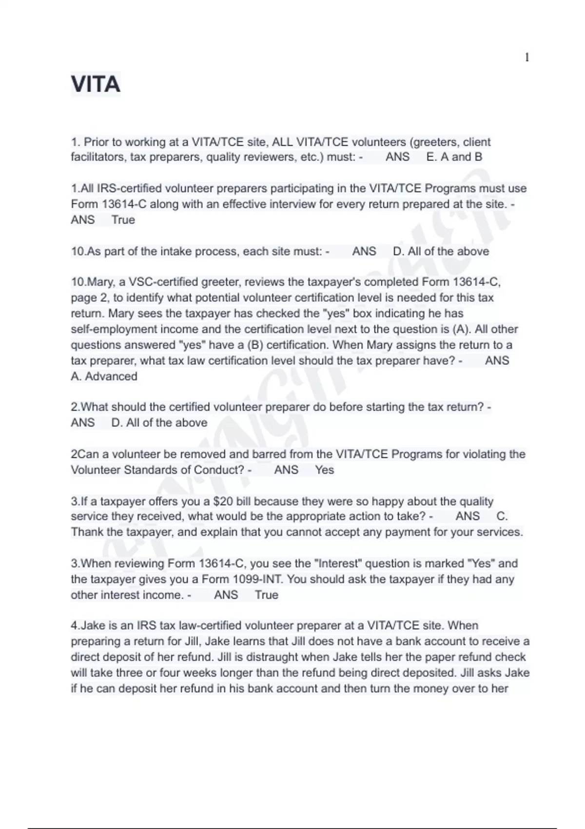 VITA Intake/ Interview Review Test Questions And Answers Updated VITA