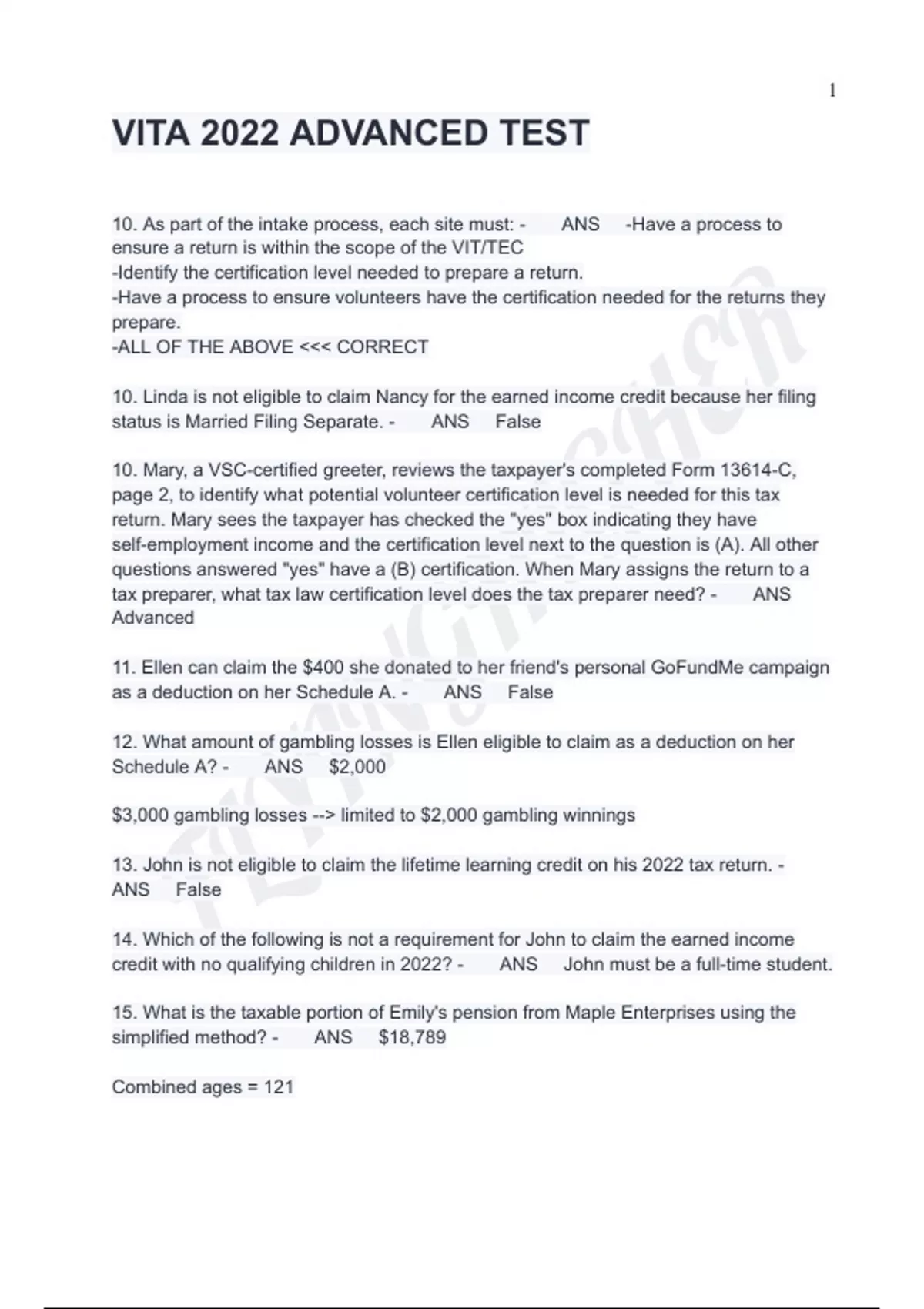 IRS VITA/TCE Advanced Certification Questions And Answers With Verified
