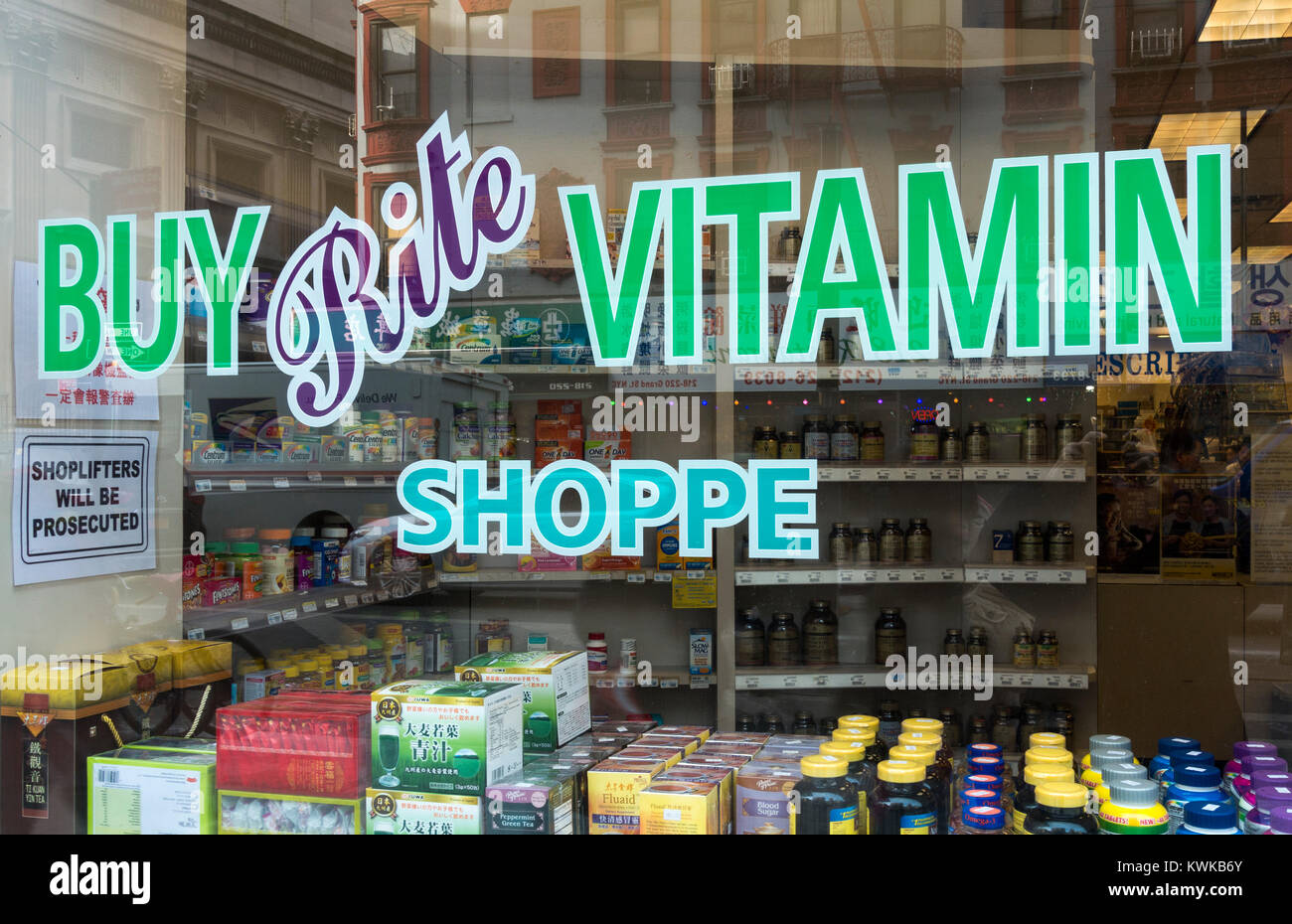 Window of a Buy Rite Vitamin Shoppe on Grand Street in Chinatown New