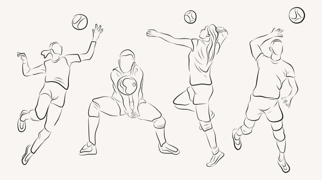Volleyball Players Outline Silhouettes Set Sketch Stock Vector (Royalty