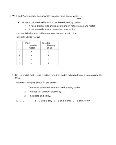 Cambridge IGCSE reactivity series multiple choice questions and answers