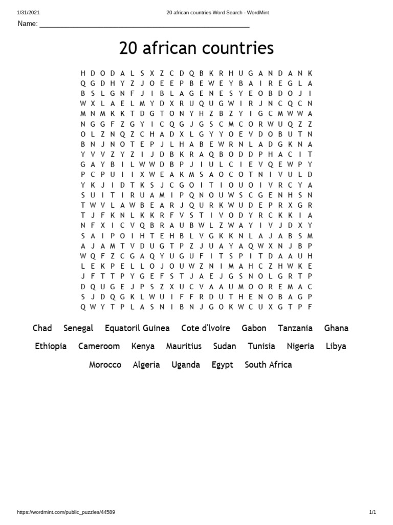 20 african countries Word Search WordMint PDF
