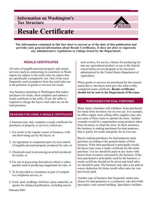 Fillable Online wastatepta RESALE CERTIFICATE Welcome to Washington