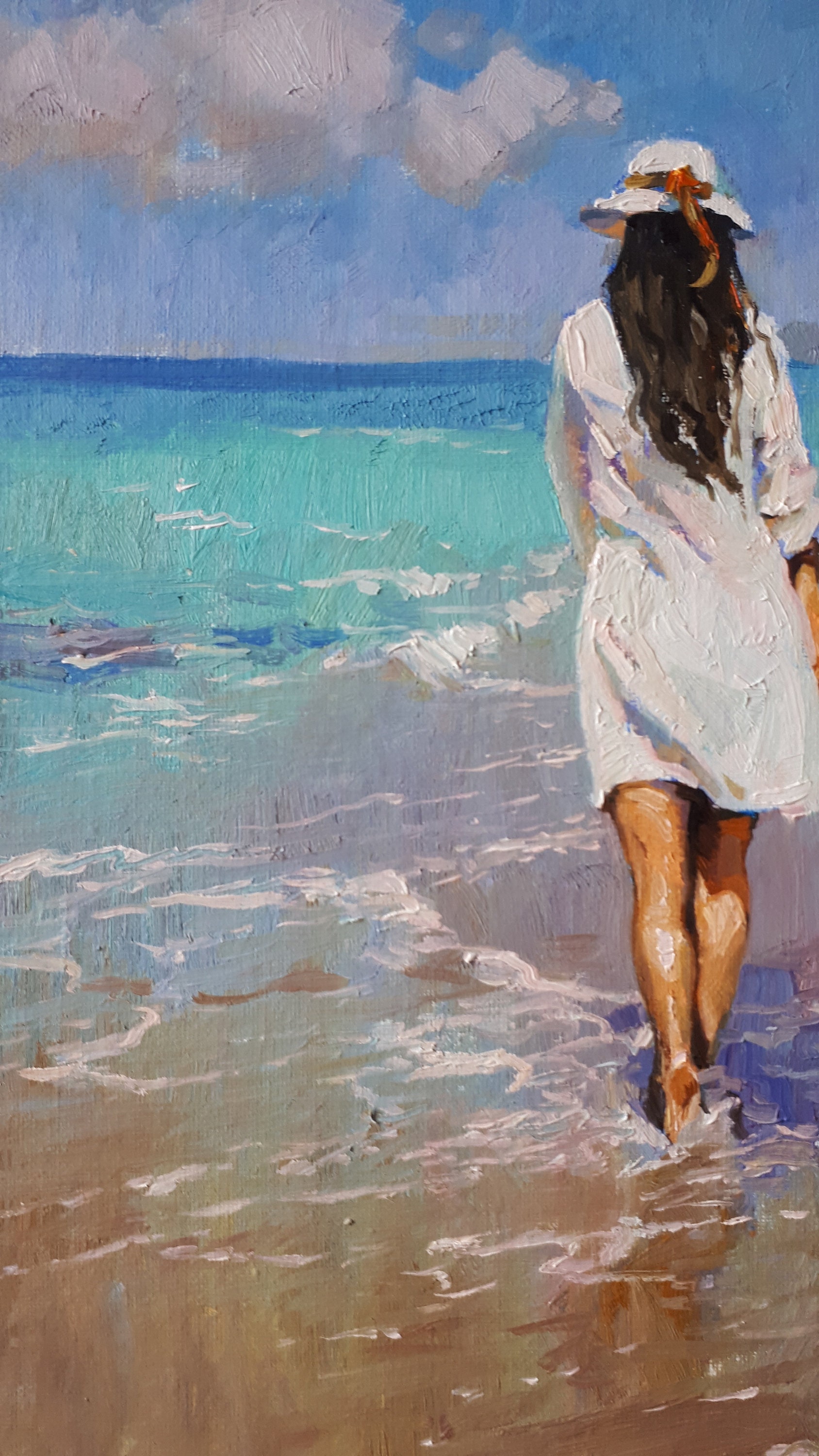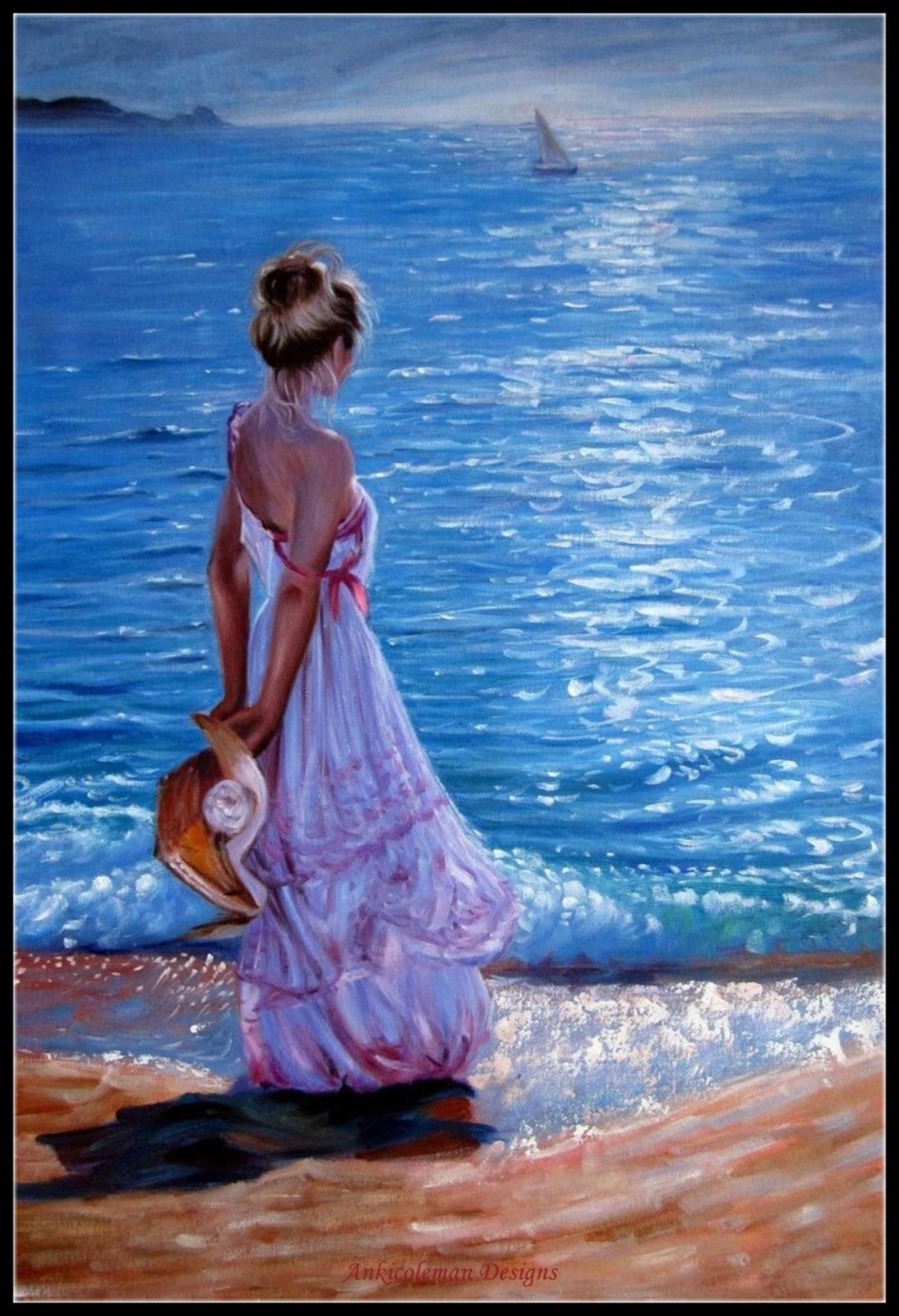 Painting of a woman walking on the beach with her hair blowing in the