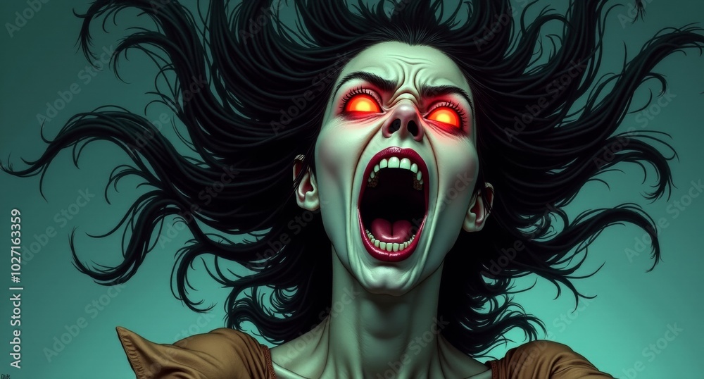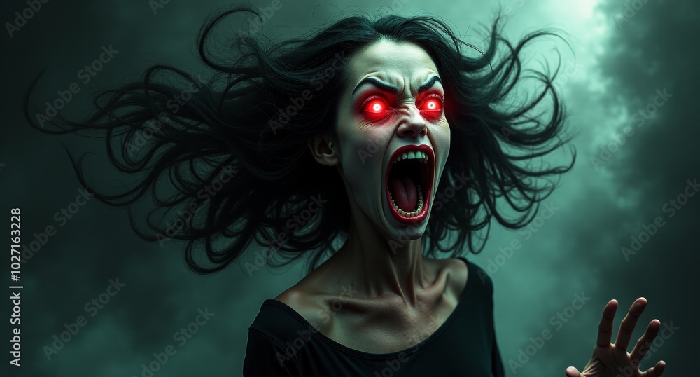 A wild haired banshee with glowing red eyes screams in a high pitched