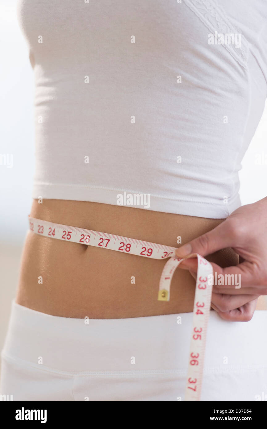 Young Woman Measuring Her Waistline with Measuring Tape Stock Photo