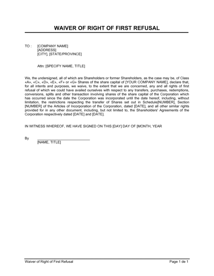 Waiver Of Right Of First Refusal Template
