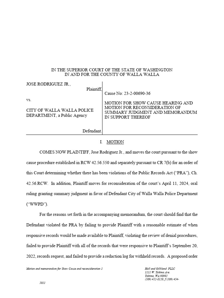 Jose Rodriguez Jr v Walla Walla Police Department Motion and