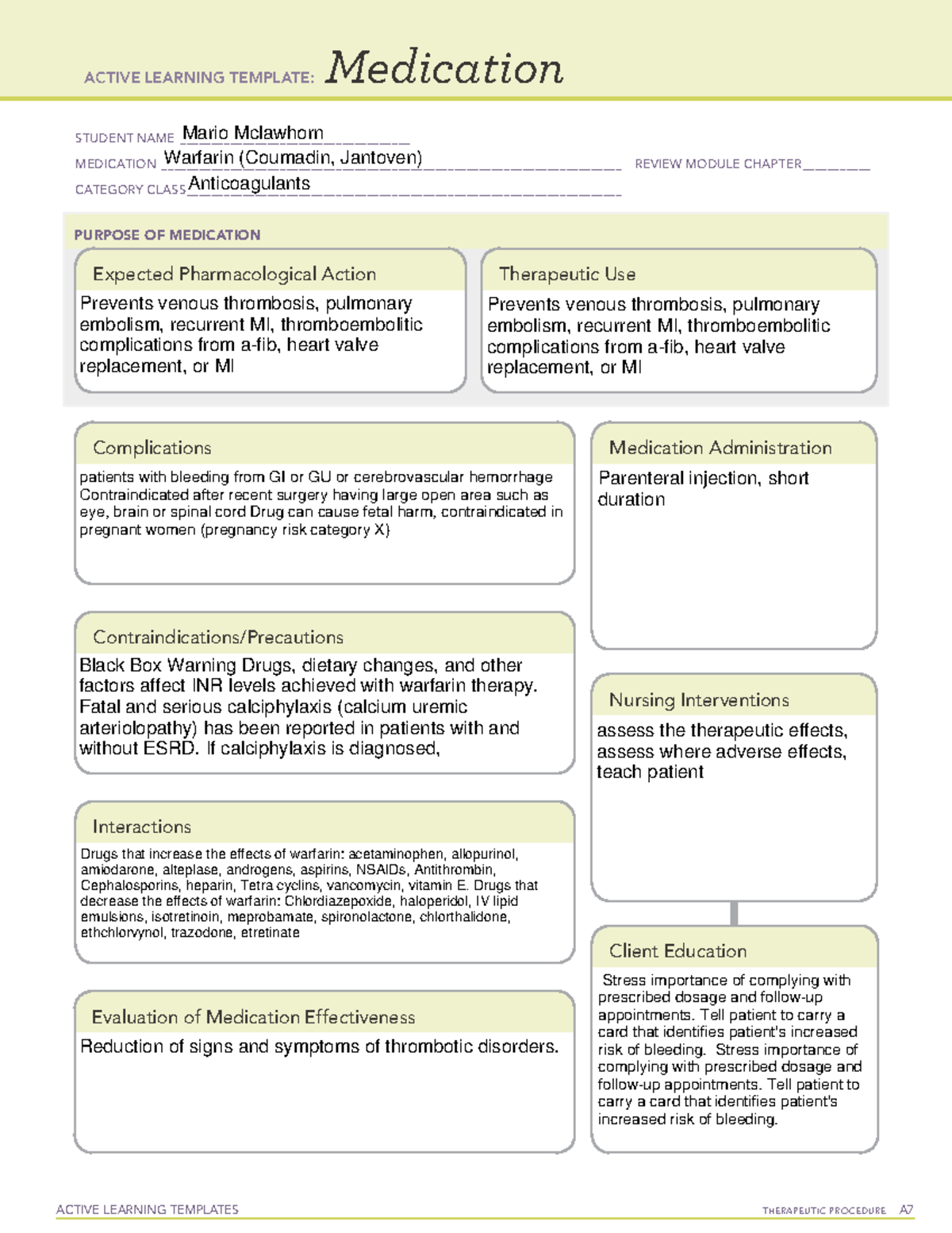 warfarin ATI medication template ACTIVE LEARNING TEMPLATE: Medication