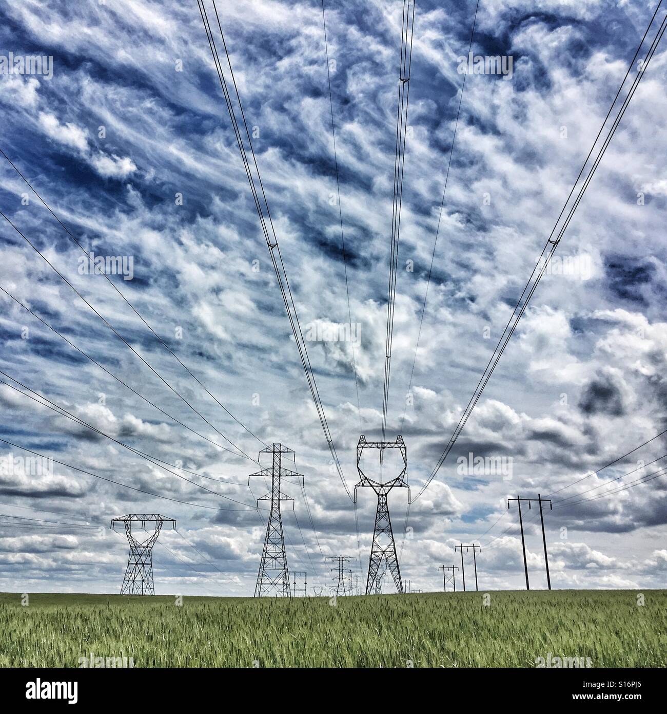 Electrical transmission lines run from Grand Coulee hydroelectric dam