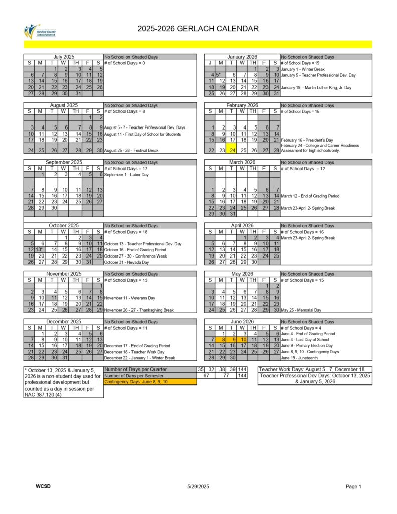 Washoe County School District Calendar 2025 2026 Holidays