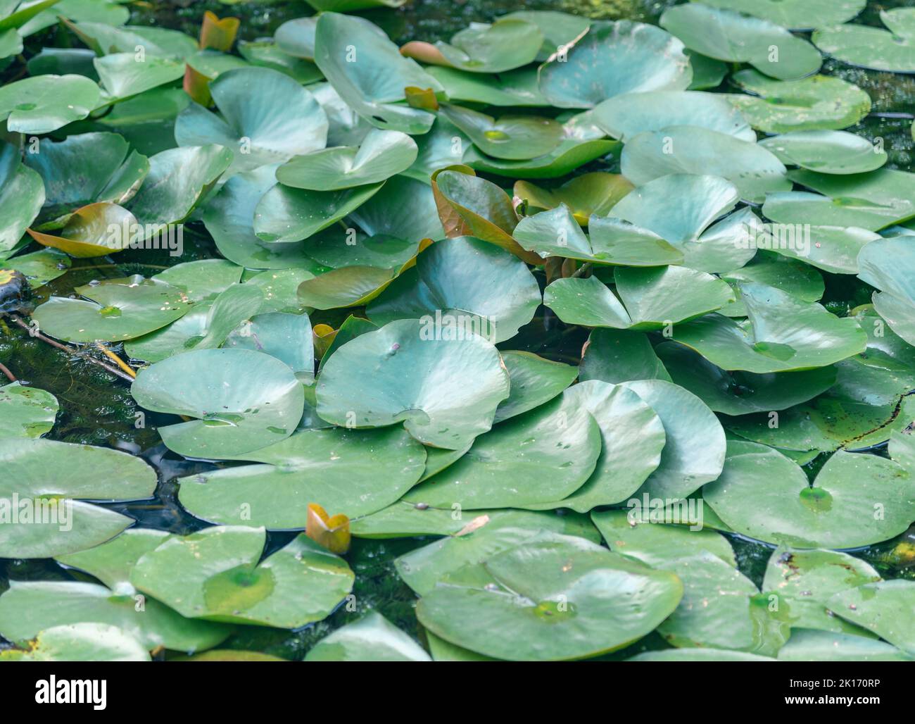 Water lily leaves with water drops closeup Green waxy leaves floating