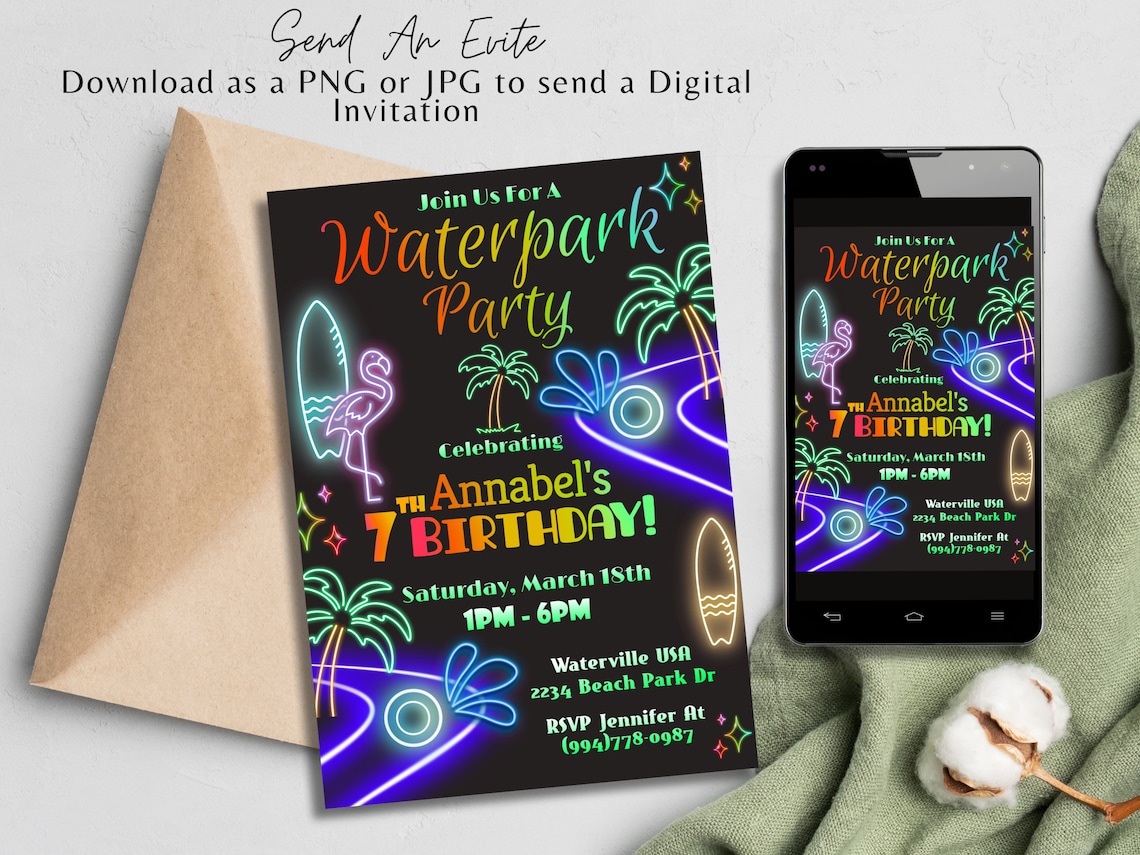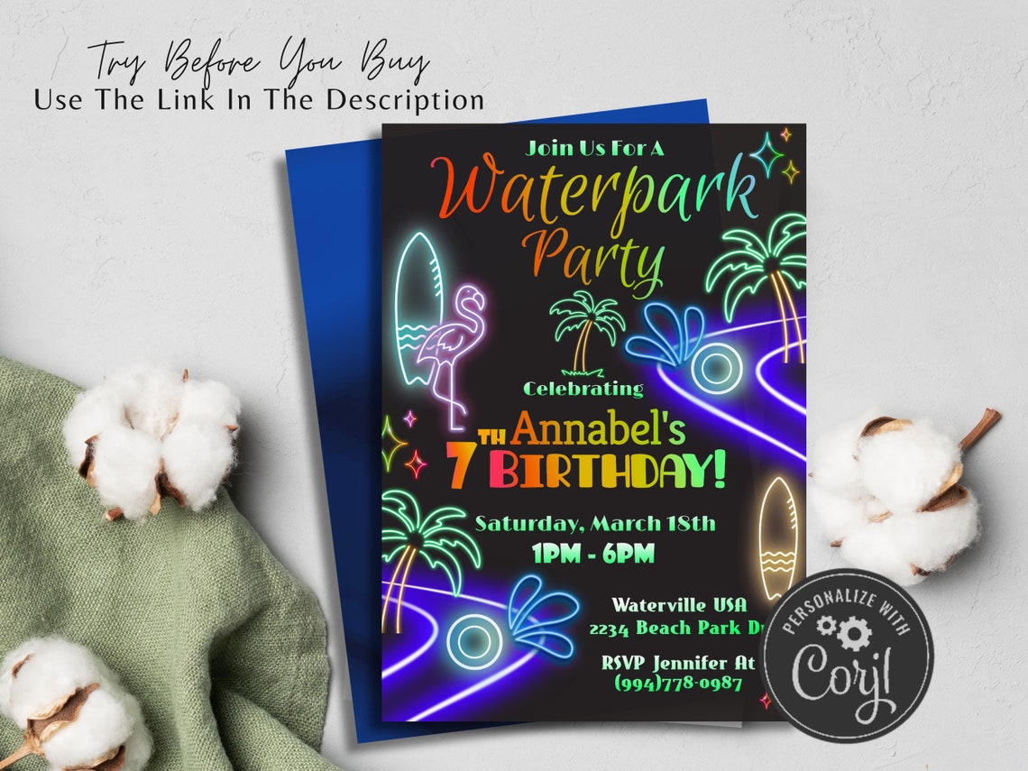 Editable Glow Neon Water Park Birthday Party Invitation Aquapark Summer